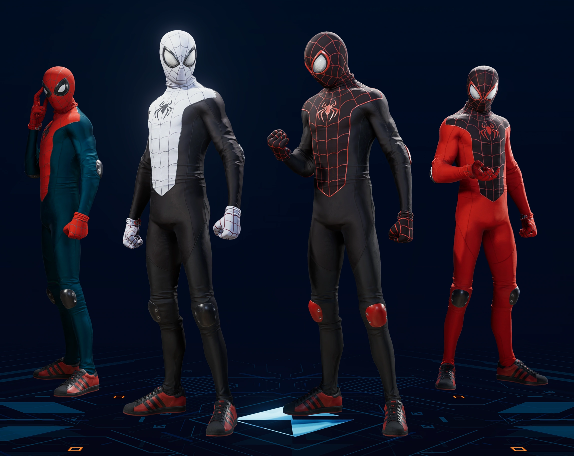 - Color 2: The suit becomes nearly monochrome, with the reds replaced with white and the blues replaced with black. His sneakers are still red, as is the spider logo on the back.